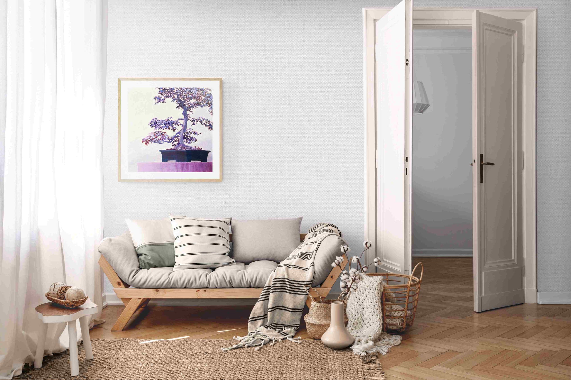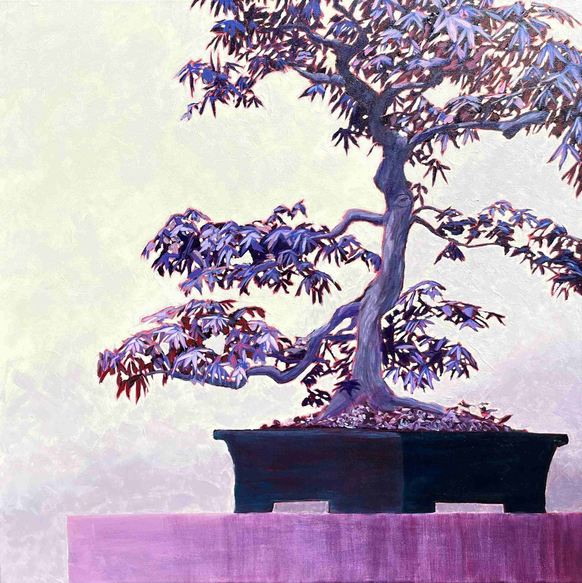 This vibrant maple bonsai invites thoughtful reflection through its rich palette and intricate details. The soft sunlight highlights the natural beauty and complexity of its tiny leaves, a reminder that illumination arises from stillness.